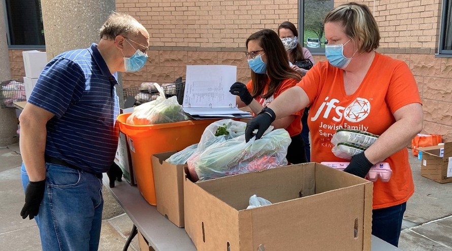 Food pantry volunteers work outside at the Jewish Federation of Kansas City amid the adoption of new pandemic-era health and safety protocols by Jewish institutions around the country. (Courtesy of JFGKC)